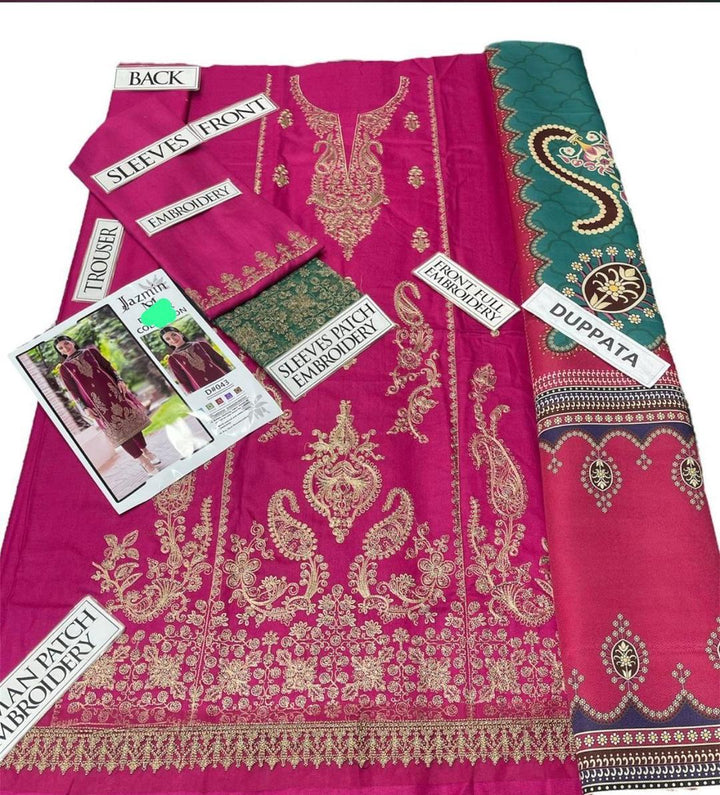 • Shirt Fabric: Lawn• Pattern: Embroidered• Shirt Front Pattern: Embroidered• Neckline: Embroidered• Sleeves Pattern: Embroidered• Daman: Embroidered• Shirt Back Pattern: Plain• Trouser Fabric: Lawn• Trouser Pattern: Plain• Dupatta Fabric: Diamond• Dupatta Pattern: Digital Print• Number Of Pieces: 3 Pcs• Package Includes: 1 x Shirt, 1 x Trouser, 1 x Dupatta• Shirt Cutting: 3 Meter• Trouser Cutting: 2.5 Meter• Dupatta Cutting: 2.5 Meter• Color: Pink• Note: There might be an error of 1-3 cm due to manual measurement, and slight color differences may occur as a result of varying lighting and monitor effects.