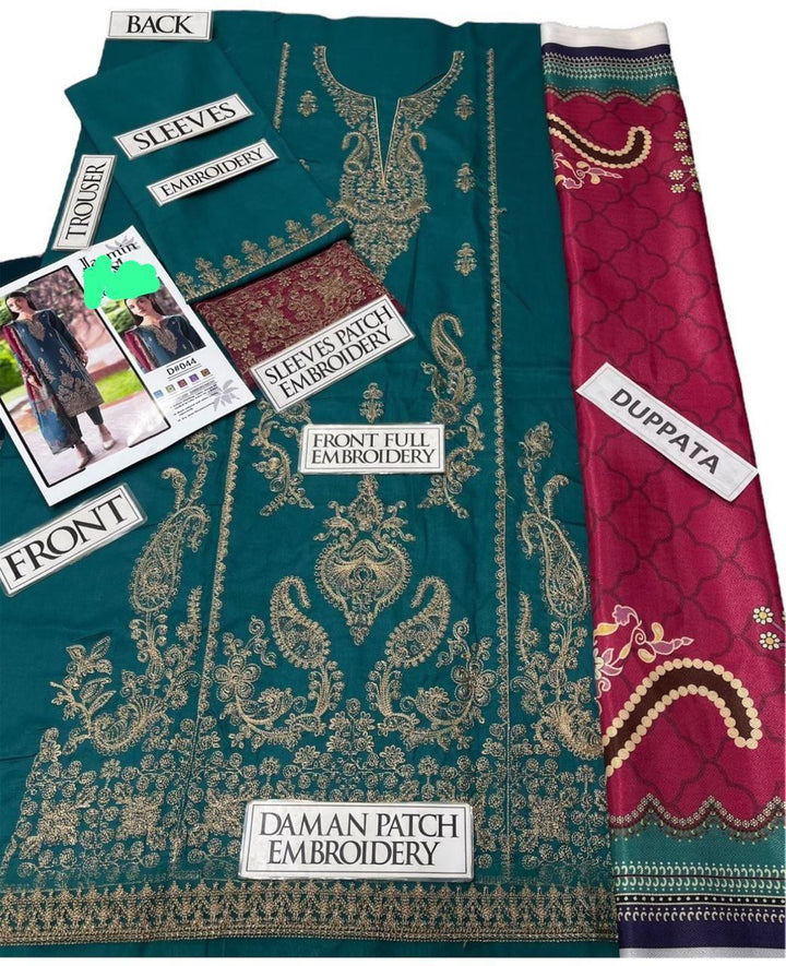 • Shirt Fabric: Lawn• Pattern: Embroidered• Shirt Front Pattern: Embroidered• Neckline: Embroidered• Sleeves Pattern: Embroidered• Daman: Embroidered• Shirt Back Pattern: Plain• Trouser Fabric: Lawn• Trouser Pattern: Plain• Dupatta Fabric: Diamond• Dupatta Pattern: Digital Print• Number Of Pieces: 3 Pcs• Package Includes: 1 x Shirt, 1 x Trouser, 1 x Dupatta• Shirt Cutting: 3 Meter• Trouser Cutting: 2.5 Meter• Dupatta Cutting: 2.5 Meter• Color: Green• Note: There might be an error of 1-3 cm due to manual measurement, and slight color differences may occur as a result of varying lighting and monitor effects.