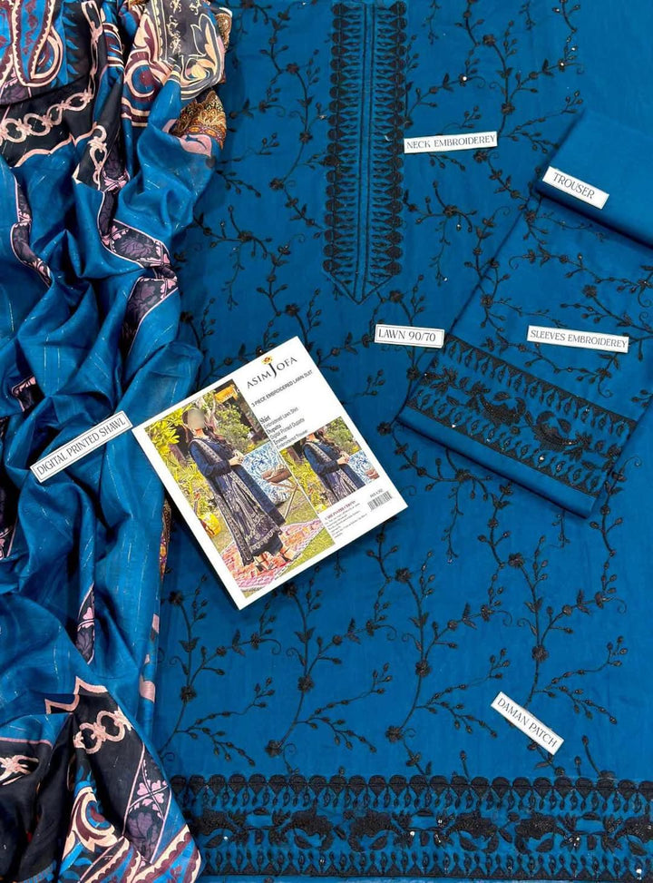 Step into timeless fashion with this premium embroidered lawn 3-piece suit by Asim Jofa. Designed for the modern woman who loves subtle glam with traditional grace, this ensemble brings together rich embroidery work and digital artistry â perfectly made for festive dinners, casual luxury and everyday royalty.